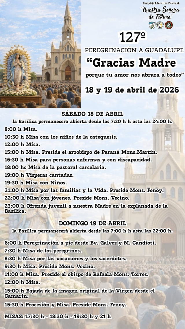 En Santa Fe tenemos una Madre, por eso este *18 y 19 de abril* vamos a visitarla peregrinando hasta su Casa y celebrando su Fiesta Anual para decirle _"Gracias Madre, porque tu amor nos abraza a todos"_