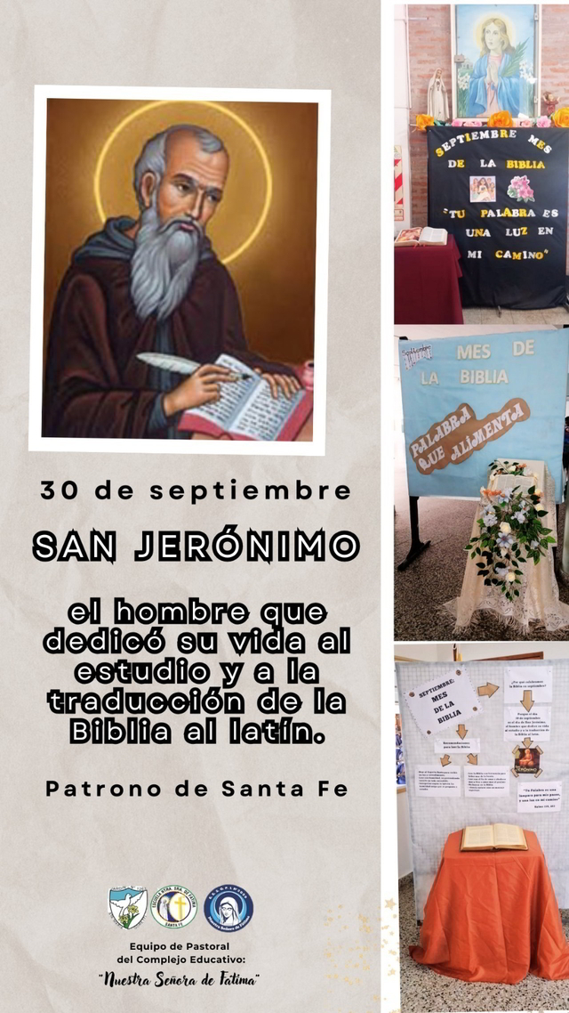 Estamos terminando SEPTIEMBRE, mes dedicado a la BIBLIA, ya que mañana martes 30 recordamos a San Jerónimo, que además de ser Patrono de Santa Fe, fue un hombre santo que dedicó su vida a la traducción de la Sagrada Escritura haciéndola más cercana y más accesible a los hombres de su época.